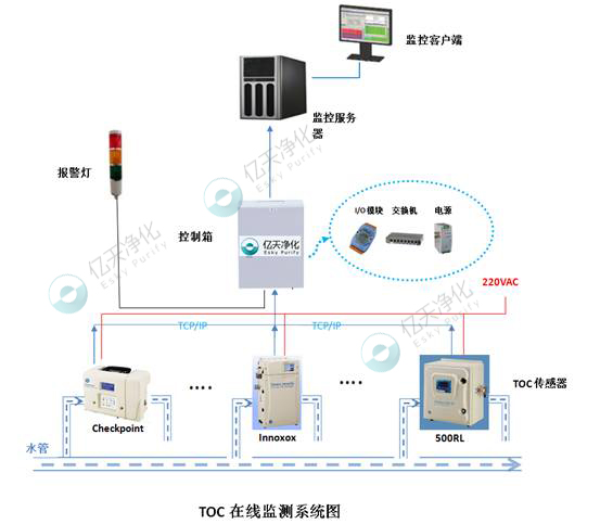 系統(tǒng)主要是由TOC傳感器、電控箱、服務(wù)器及監(jiān)測軟件組成。通過CheckPoint TOC傳感器采集數(shù)據(jù),電控系統(tǒng)傳輸數(shù)據(jù),監(jiān)控服務(wù)器負責(zé)保存處理數(shù)據(jù),達到數(shù)據(jù)實時在線監(jiān)測目的,還可以提供各種輔助功能,如:TOC歷史數(shù)據(jù)查詢、圖表生成、操作記錄、報警預(yù)警等,幫助用戶及時發(fā)現(xiàn)問題、分析問題、解決問題。