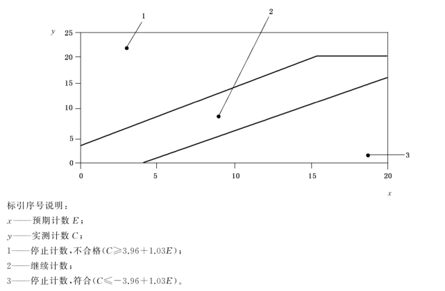 e) 如果累積實(shí)測(cè)計(jì)數(shù)穿過(guò)上限,在該點(diǎn)停止采樣,認(rèn)為空氣不符合規(guī)定的等級(jí)限值; f) 如果累積實(shí)測(cè)計(jì)數(shù)穿過(guò)下限,在該點(diǎn)停止采樣,認(rèn)為空氣符合規(guī)定的等級(jí)限值;