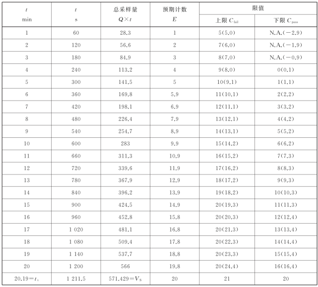 g) 如果累積實(shí)測(cè)計(jì)數(shù)保持在上限與下限之間,采樣將繼續(xù)進(jìn)行,如果在規(guī)定的采樣周期內(nèi),總計(jì)數(shù)達(dá)到或小于20,并且未穿過(guò)上限,則空氣符合指定級(jí)別的限值。