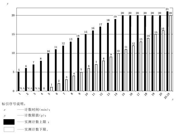 在圖 D.2 中畫(huà)出了實(shí)測(cè)計(jì)數(shù)的上下限與計(jì)數(shù)獲取時(shí)間之間的關(guān)系。其所在列表示的是在1 min 的時(shí)間間隔內(nèi)的限值(上限和下限)。