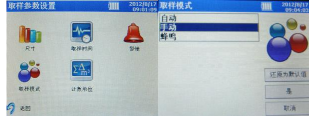 3、蜂鳴模式:“設(shè)置”頁面中選擇“取樣模式”,選擇“蜂鳴”。“取樣時間”可不設(shè)定。“設(shè)置”頁面,選擇“取樣”,再選擇“警報(bào)”。可根據(jù)需求設(shè)置不同粒徑分子的警報(bào)閾值。設(shè)定完畢后點(diǎn)擊“是”。返回主屏幕按啟動鍵進(jìn)行啟動測量,當(dāng)測定數(shù)值超過警報(bào)設(shè)定閾值是,儀器會發(fā)出警報(bào)。