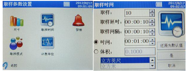 3、取樣時間設(shè)置:“設(shè)置”頁面選擇“取樣時間”,其中可以通過軟鍵盤修改取樣個數(shù)、取樣延時時間、取樣間隔時間、每次取樣時間或每次取樣體積,設(shè)置完畢后選擇“是”。